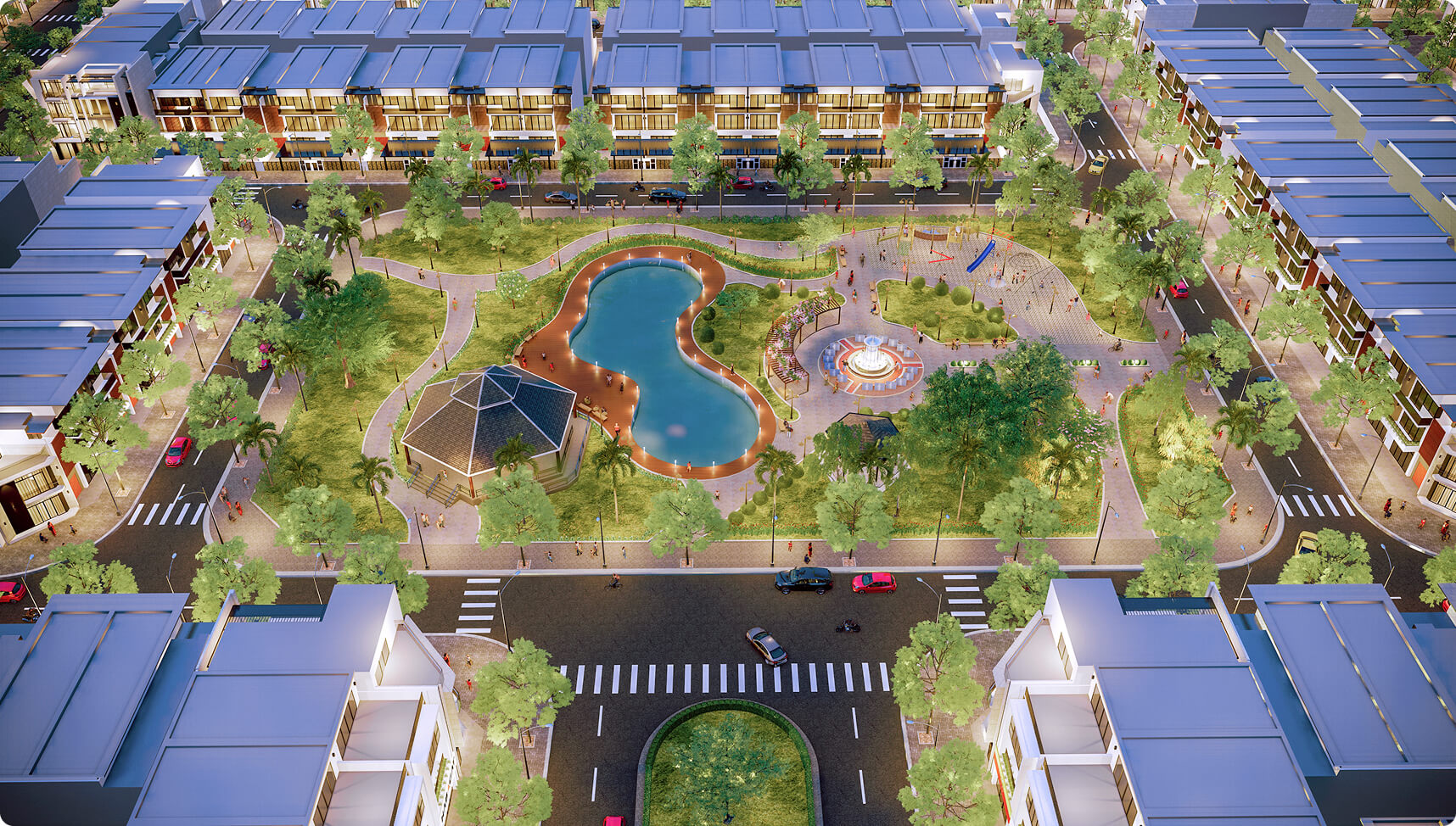 | Tiện ích: | hồ bơi, trung tâm thương mại, phố đi bộ dài 1.5km, trung tâm hội nghị, hồ thiên nga, trường học,… |